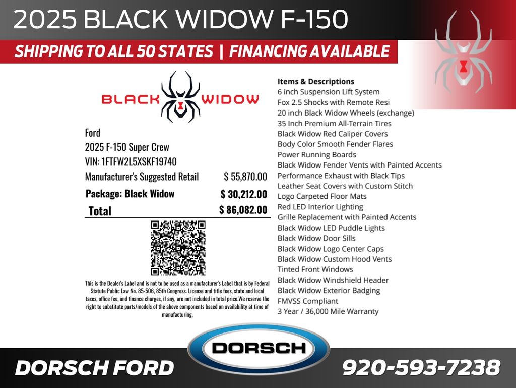 With its lifted suspension, custom Black Widow wheels, and signature exterior design, this truck is engineered to turn heads while maintaining the power and durability you expect from an F-150. Inside, premium touches and exclusive Black Widow branding elevate comfort and style.