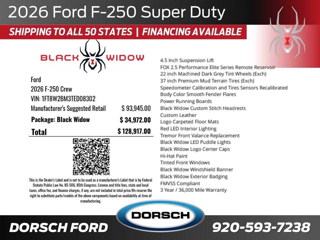 With its lifted suspension, custom Black Widow wheels, and signature exterior details, the F-250 Black Widow commands attention on any road or job site. Inside, exclusive Black Widow branding and refined interior features bring comfort and style to match its rugged performance.
