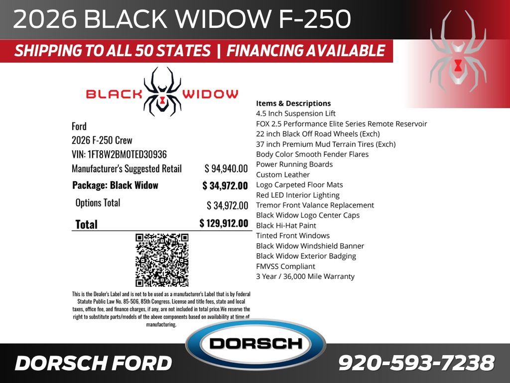 With its lifted suspension, custom Black Widow wheels, and signature exterior design, this truck is engineered to turn heads while maintaining the power and durability you expect from an F-150. Inside, premium touches and exclusive Black Widow branding elevate comfort and style.