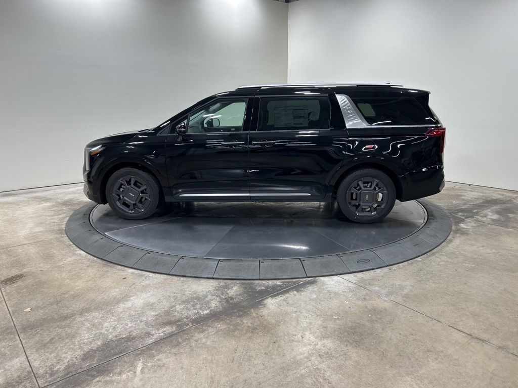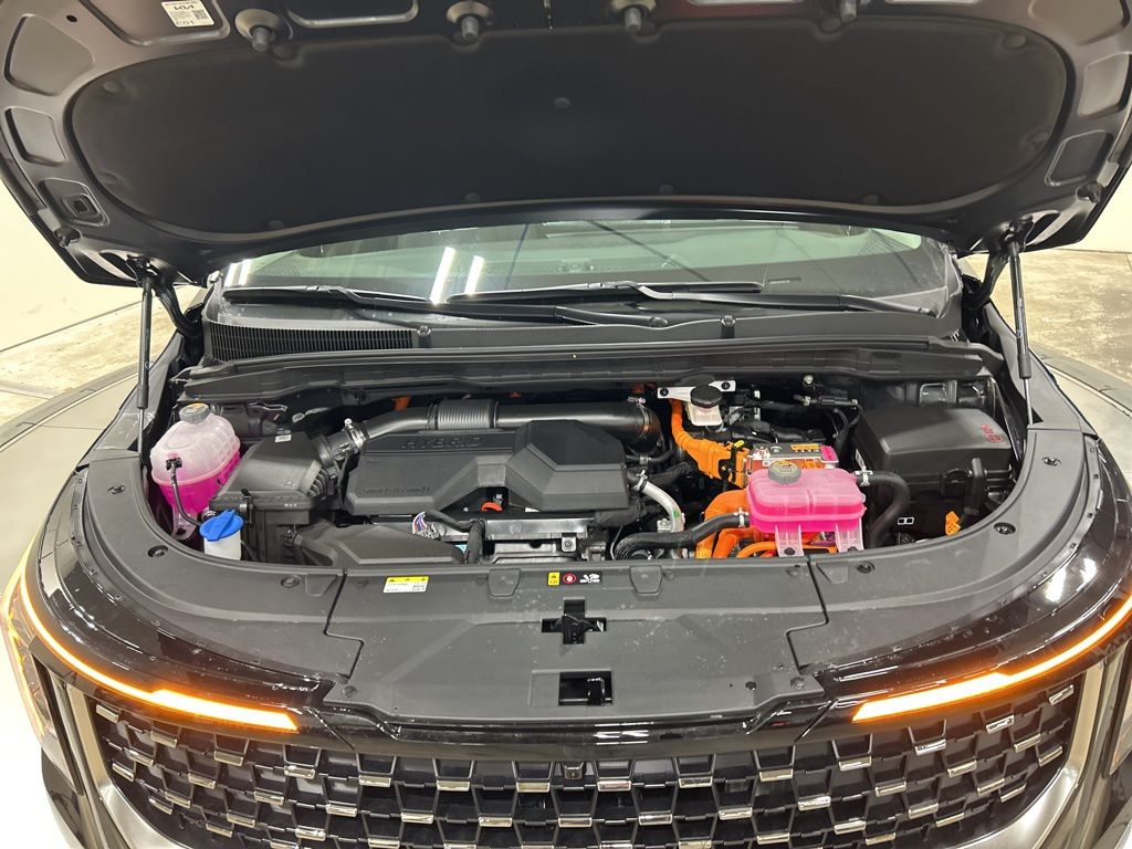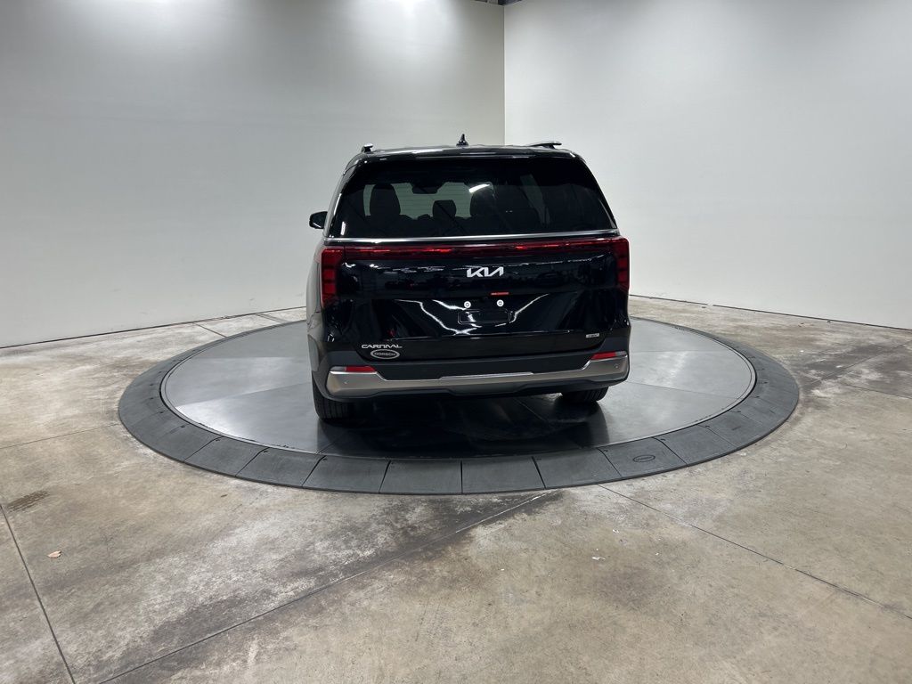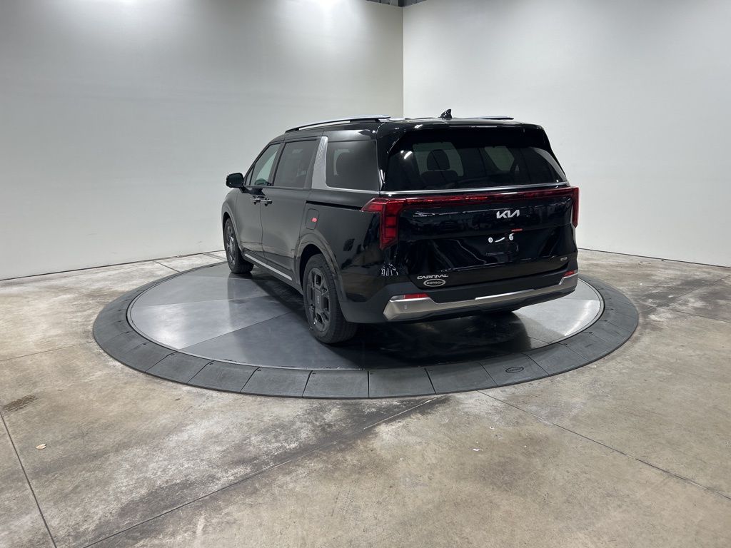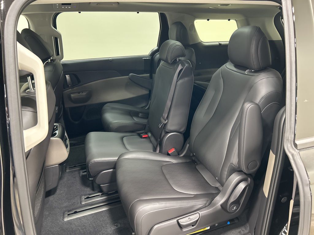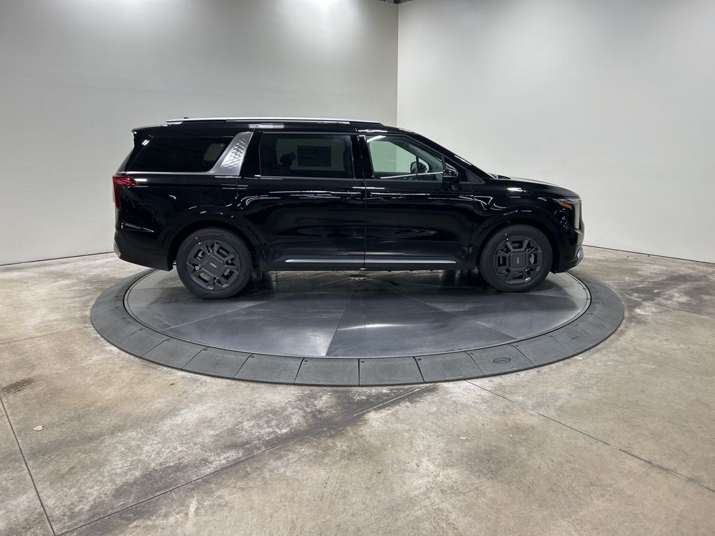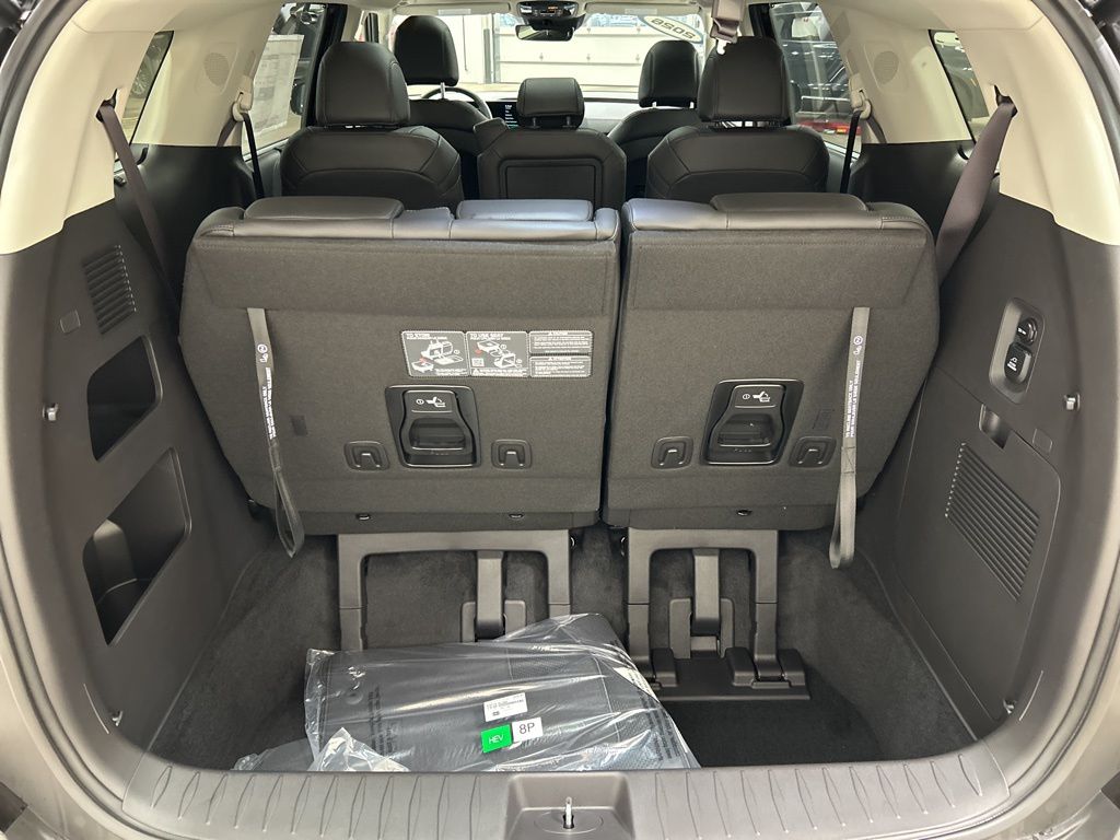 1.6L I4 DGI Hybrid Turbocharged DOHC 16V LEV3-SULEV30, 3rd row seats: split-bench, 4-Wheel Disc Brakes, 8 Speakers, ABS brakes, Air Conditioning, AM/FM radio: SiriusXM, Apple CarPlay & Android Auto, Artificial Leather Seat Trim, Auto High-beam Headlights, Auto-Dimming Mirror w/HomeLink, Automatic temperature control, Brake assist, Bumpers: body-color, Carpeted Floor Mats (8-Passenger), Compass, Custom Wheels, Delay-off headlights, Driver door bin, Driver vanity mirror, Dual front impact airbags, Dual front side impact airbags, Electronic Stability Control, Emergency communication system, Exterior Parking Camera Rear, Four wheel independent suspension, Front anti-roll bar, Front Bucket Seats, Front Center Armrest, Front dual zone A/C, Front fog lights, Front reading lights, Fully automatic headlights, Heated & Ventilated Front Bucket Seats, Heated door mirrors, Heated front seats, Illuminated entry, Knee airbag, Leather Shift Knob, Leather steering wheel, Low tire pressure warning, Memory seat, Navigation System, Occupant sensing airbag, Outside temperature display, Overhead airbag, Overhead console, Panic alarm, Passenger door bin, Passenger vanity mirror, Power 2nd-Row Moonroof, Power door mirrors, Power driver seat, Power Liftgate, Power moonroof, Power passenger seat, Power steering, Power windows, Radio: Navigation System w/SiriusXM, Rain sensing wipers, Rear air conditioning, Rear anti-roll bar, Rear reading lights, Rear window defroster, Rear window wiper, Reclining 3rd row seat, Remote keyless entry, Security system, Speed control, Speed-sensing steering, Split folding rear seat, Spoiler, Steering wheel mounted audio controls, Tachometer, Telescoping steering wheel, Tilt steering wheel, Traction control, Trip computer, Turn signal indicator mirrors, Variably intermittent wipers, Ventilated front seats, Wheels: 19" Black Alloy, Wheels: 19" Black D-Cut Customizing, 1.6L I4 DGI Hybrid Turbocharged DOHC 16V LEV3-SULEV30. 34/31 City/Highway MPG 2026 Kia Carnival Hybrid SX
