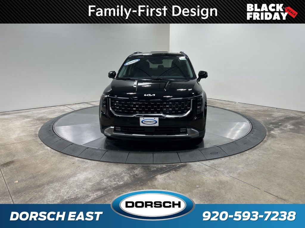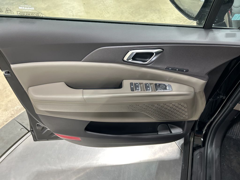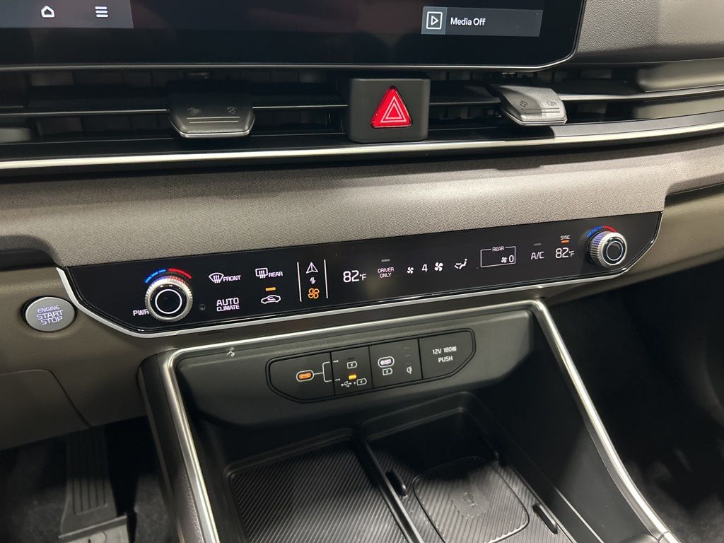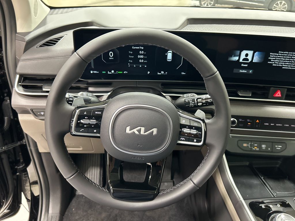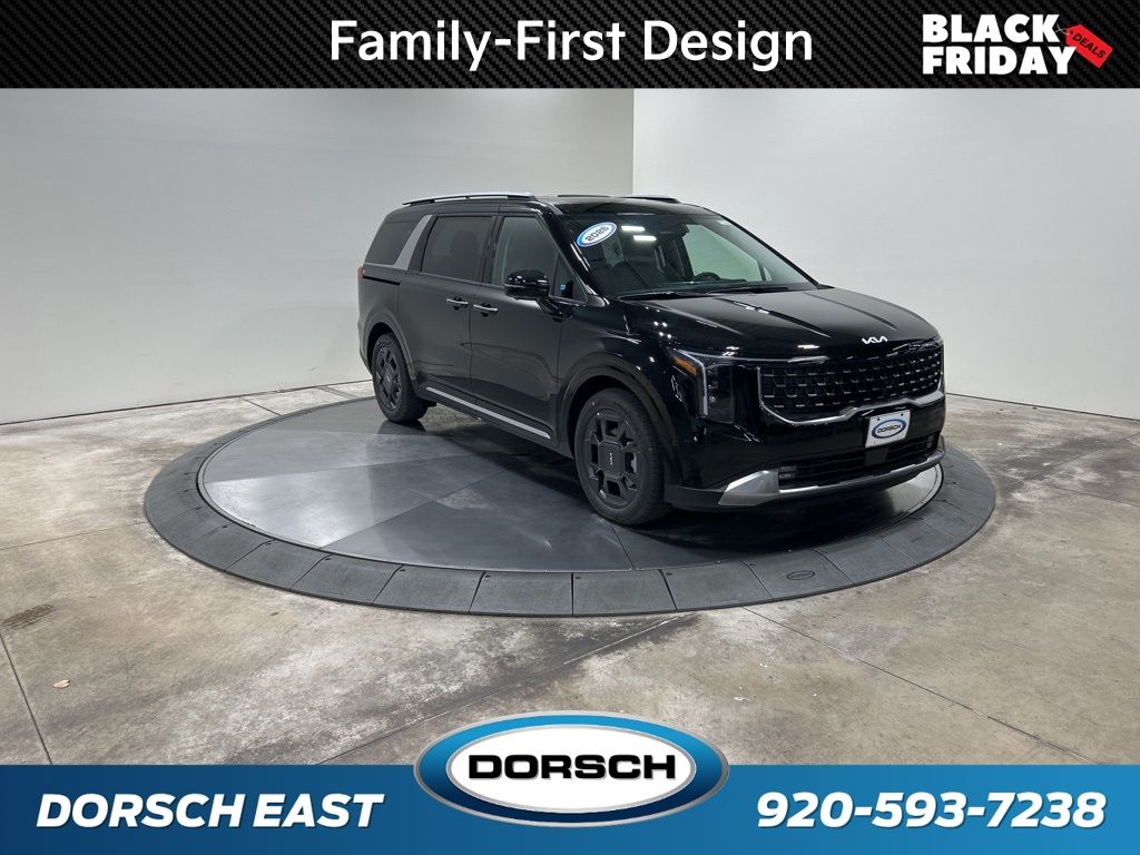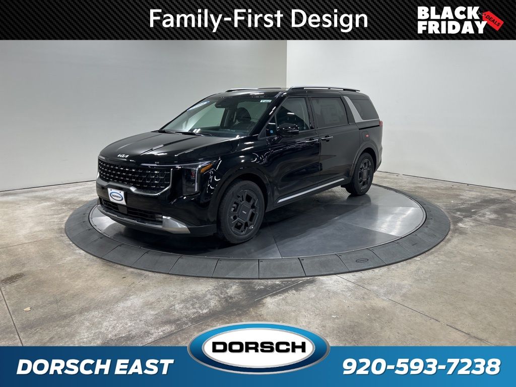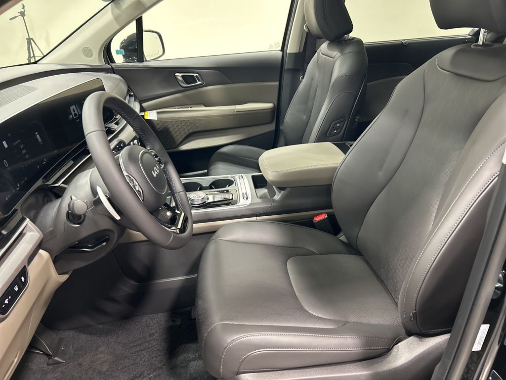 1.6L I4 DGI Hybrid Turbocharged DOHC 16V LEV3-SULEV30, 3rd row seats: split-bench, 4-Wheel Disc Brakes, 8 Speakers, ABS brakes, Air Conditioning, AM/FM radio: SiriusXM, Apple CarPlay & Android Auto, Artificial Leather Seat Trim, Auto High-beam Headlights, Auto-Dimming Mirror w/HomeLink, Automatic temperature control, Brake assist, Bumpers: body-color, Carpeted Floor Mats (8-Passenger), Compass, Custom Wheels, Delay-off headlights, Driver door bin, Driver vanity mirror, Dual front impact airbags, Dual front side impact airbags, Electronic Stability Control, Emergency communication system, Exterior Parking Camera Rear, Four wheel independent suspension, Front anti-roll bar, Front Bucket Seats, Front Center Armrest, Front dual zone A/C, Front fog lights, Front reading lights, Fully automatic headlights, Heated & Ventilated Front Bucket Seats, Heated door mirrors, Heated front seats, Illuminated entry, Knee airbag, Leather Shift Knob, Leather steering wheel, Low tire pressure warning, Memory seat, Navigation System, Occupant sensing airbag, Outside temperature display, Overhead airbag, Overhead console, Panic alarm, Passenger door bin, Passenger vanity mirror, Power 2nd-Row Moonroof, Power door mirrors, Power driver seat, Power Liftgate, Power moonroof, Power passenger seat, Power steering, Power windows, Radio: Navigation System w/SiriusXM, Rain sensing wipers, Rear air conditioning, Rear anti-roll bar, Rear reading lights, Rear window defroster, Rear window wiper, Reclining 3rd row seat, Remote keyless entry, Security system, Speed control, Speed-sensing steering, Split folding rear seat, Spoiler, Steering wheel mounted audio controls, Tachometer, Telescoping steering wheel, Tilt steering wheel, Traction control, Trip computer, Turn signal indicator mirrors, Variably intermittent wipers, Ventilated front seats, Wheels: 19" Black Alloy, Wheels: 19" Black D-Cut Customizing, 1.6L I4 DGI Hybrid Turbocharged DOHC 16V LEV3-SULEV30. 34/31 City/Highway MPG 2026 Kia Carnival Hybrid SX