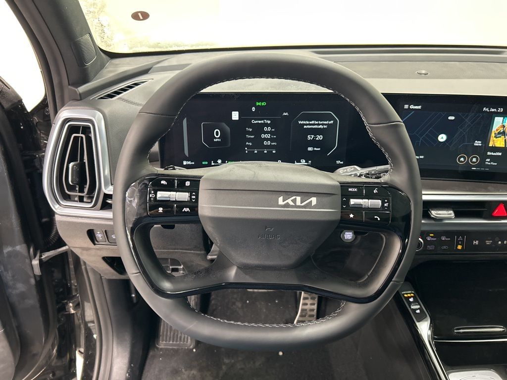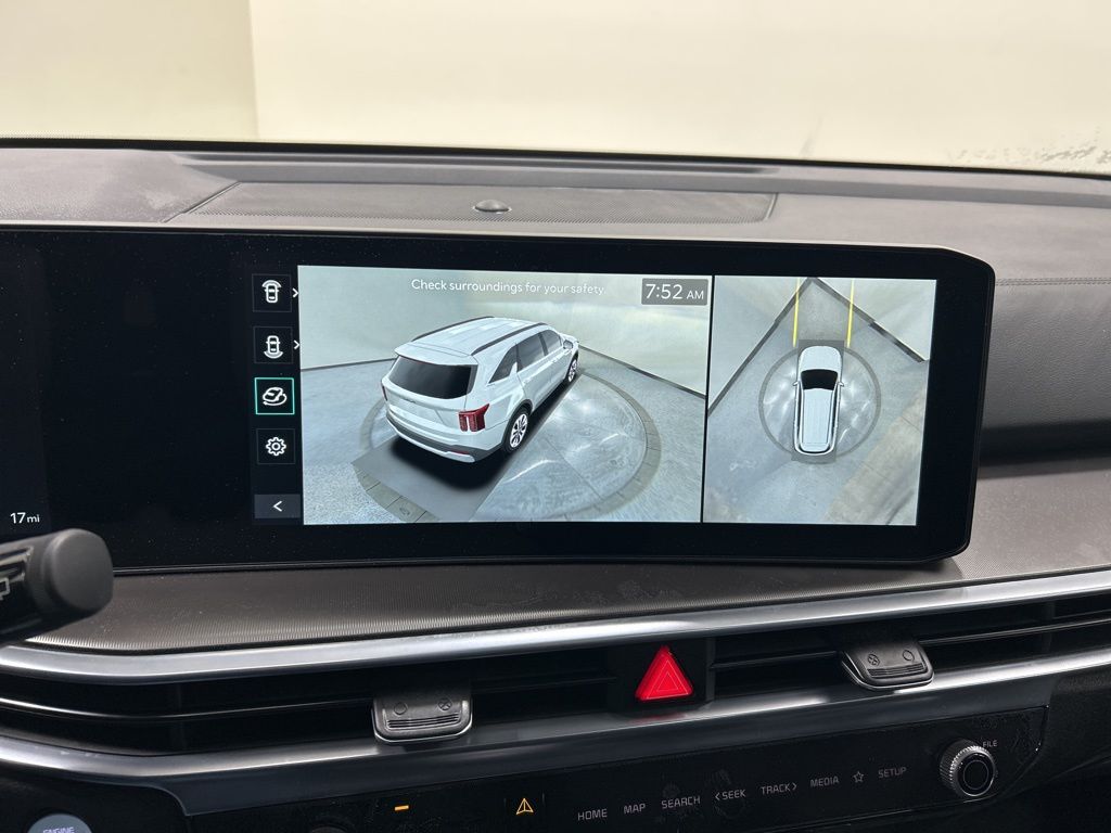 1.6L Turbo GDI 4-Cylinder, 12 Speakers, 3rd row seats: split-bench, 4-Wheel Disc Brakes, ABS brakes, Air Conditioning, AM/FM radio: SiriusXM, Apple CarPlay & Android Auto, Auto High-beam Headlights, Auto-dimming Rear-View mirror, Automatic temperature control, Brake assist, Bumpers: body-color, Carpeted Floor Mats, Custom Wheels, Delay-off headlights, Driver door bin, Driver vanity mirror, Dual front impact airbags, Dual front side impact airbags, Electronic Stability Control, Emergency communication system: 911 Connect, Exterior Parking Camera Rear, Four wheel independent suspension, Front anti-roll bar, Front Bucket Seats, Front Center Armrest, Front dual zone A/C, Front fog lights, Front reading lights, Fully automatic headlights, Garage door transmitter: HomeLink, Heated & Ventilated Front Bucket Seats, Heated door mirrors, Heated front seats, Heated rear seats, Heated steering wheel, Illuminated entry, Knee airbag, Leather steering wheel, Low tire pressure warning, Memory seat, Mudguards, Navigation System, Occupant sensing airbag, Outside temperature display, Overhead airbag, Overhead console, Panic alarm, Passenger door bin, Passenger vanity mirror, Perforated Genuine Leather Seat Trim, Power door mirrors, Power driver seat, Power Liftgate, Power moonroof, Power passenger seat, Power steering, Power windows, Radio data system, Radio: AM/FM/SiriusXM Audio System, Rain sensing wipers, Rear anti-roll bar, Rear reading lights, Rear side impact airbag, Rear window defroster, Rear window wiper, Remote keyless entry, Security system, Speed control, Speed-sensing steering, Split folding rear seat, Spoiler, Steering wheel mounted audio controls, Tachometer, Telescoping steering wheel, Tilt steering wheel, Tow Hitch (PnP), Traction control, Trip computer, Turn signal indicator mirrors, Variably intermittent wipers, Ventilated front seats, Wheels: 19" Machine-Finished Aero Alloy, 1.6L Turbo GDI 4-Cylinder. 32/35 City/Highway MPG 2026 Kia Sorento Hybrid X-Line SX Prestige