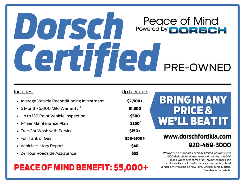 Check out our HUGE selection of QUALITY pre-owned vehicles from two convenient Green Bay locations at www.dorschfordkia.com. Stop by or call us today at (920) 593-7238.